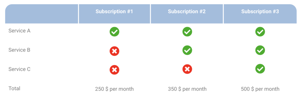 En définitive, les fournisseurs de services proposent généralement une gamme d’abonnements dont le prix diffère en fonction de tous les services inclus :
