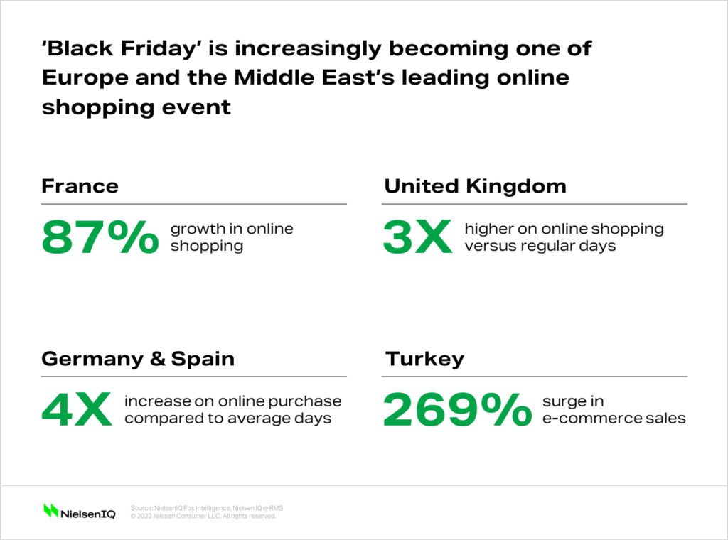 C’est probablement la saison des achats la plus attendue au monde. Selon NielsenIQ, de nombreux pays européens connaissent un pic important de ventes en ligne pendant la période des fêtes du shopping – en 2021, la France a connu une croissance de 87 % des achats en ligne pendant l’événement, par rapport à la moyenne hebdomadaire des achats en ligne le reste de l’année. Sans parler de la Turquie, où les ventes en ligne ont augmenté de 269 % pendant le Black Friday !